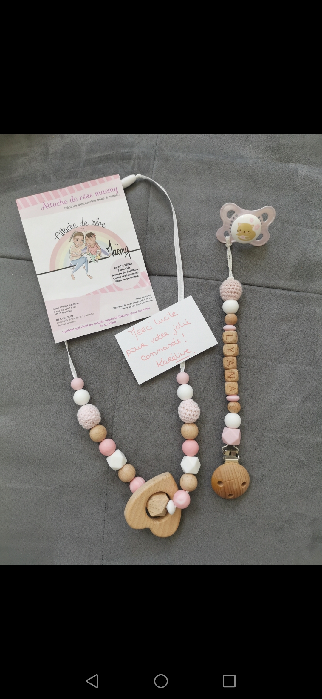 Attache tétine parfaite, envoi rapide et matériaux de qualité. Kareline, nous communique la photo avant l’assemblage pour valider avant l’envoi. Je recommande ++++++ Merci beaucoup je suis ravie